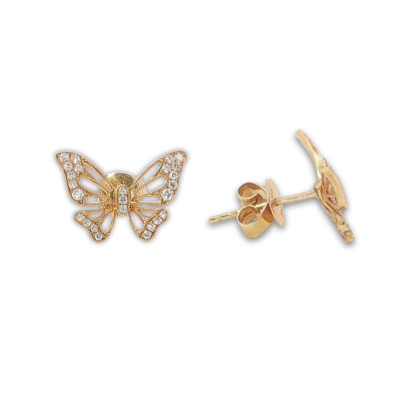 One pair of Diamond Butterfly Studs Earrings Featuring 50 Round Diamonds Weighing 0.27ctw with SI1 F-G Color and Clarity. Crafted in 14kt Yellow Gold. Friction style Earring Backs.