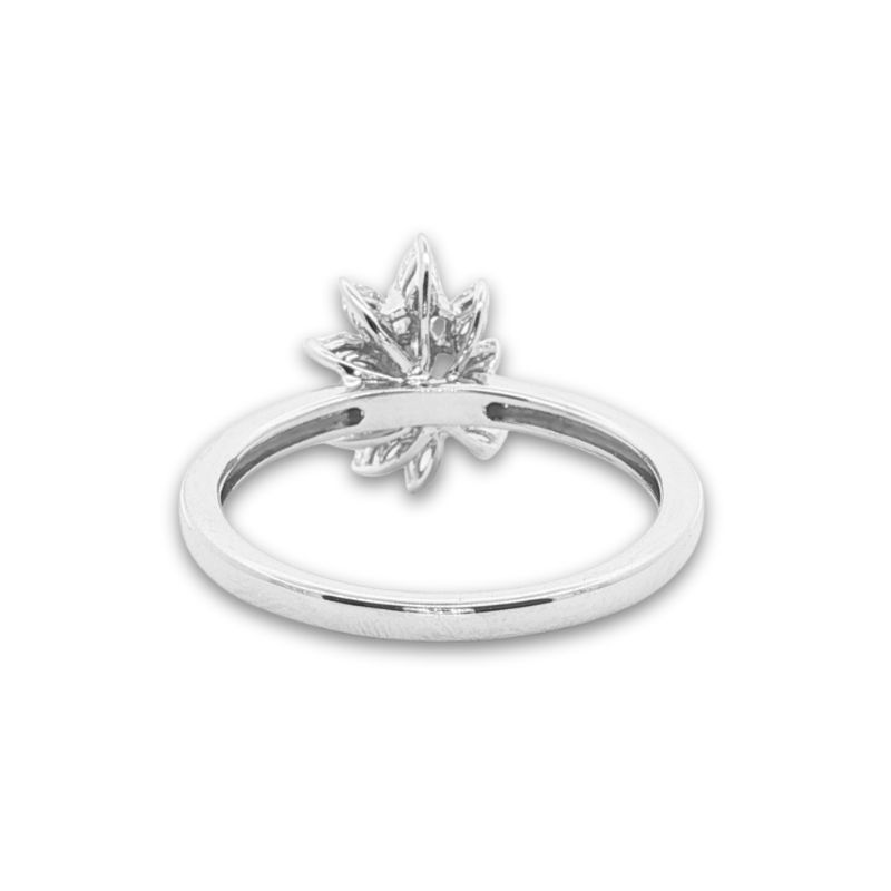 One diamond cluster ring featuring 11 prong set, SI1 F-G, diamonds total, 8 marquise weighing 0.30ctw, 3 pears weighing 0.11ctw, with a total carat weight of 0.41ctw. 1.9mm wide shank. Finger Size 6.5. Crafted in 18kt polished white gold.