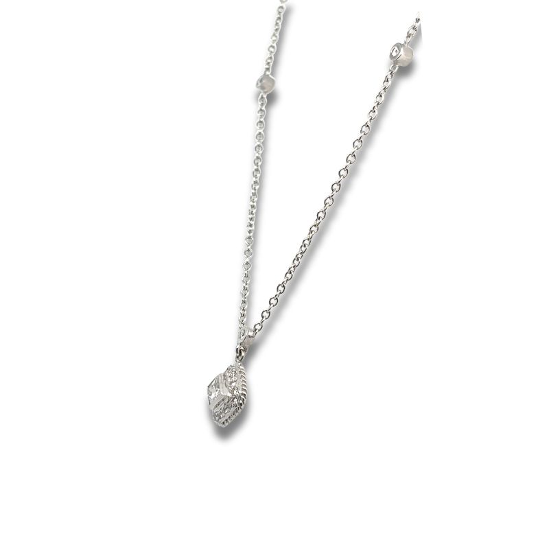Center Princess Cut Diamond at 0.40ctw, and 19 Round Diamonds Pave set around and 2 by Chain at 0.25ctw. 11mm Wide Pendant, Crafted in 14kt White Gold on 18~22 Chain