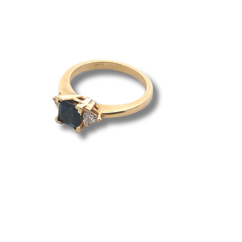 2 Trillion Prong set at 0.26ctw, SI-1 Clarity and F Color. 5.0mm Blue Sapphire Center at 0.77ctw, AA Clarity. Crafted in 14kt Yellow