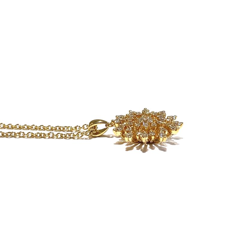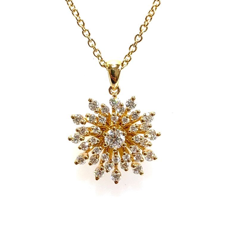 37 Round Diamonds Prong Set at 0.73ctw, VS Clarity and F Color. 16mm Wide Snoflake Crafted in 14kt Yellow Gold on 18~22 Chain with Loop at 16~22