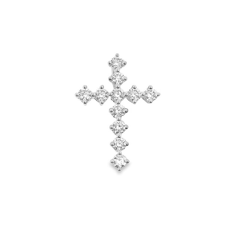 Compass Cross (N-S-E-W Prongs), 11 round Lab Grown Diamonds Prong Set at 0.88ctw, VS Clarity and F Color. 29mm Long and Crafted in 14kt White Gold. Available in White, Yellow and Rose Gold.
