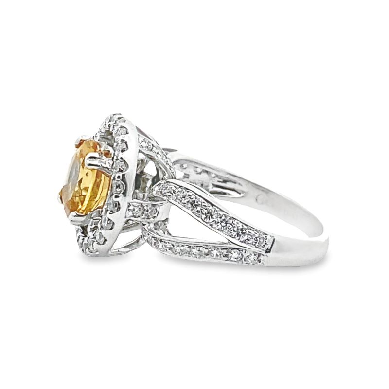 Splt Halo Ring with 70 Round Diamonds Prong Set at1.09ctw, SI-1 Clarity, and G in Color. 8.0mm Citrine Weighing at 1.51ct. Crafted in 18kt White.