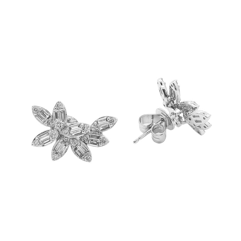 Petal Earrings with 32 Round Diamonds at 0.25ctw and 32 Baguette Diamonds at 0.68ctw, SI-1 Clarity and F-G Color. 17mm Wide and Crafted in 18kt White Gold