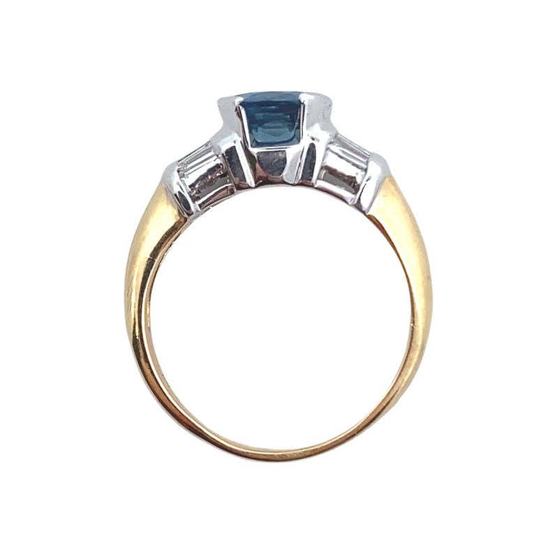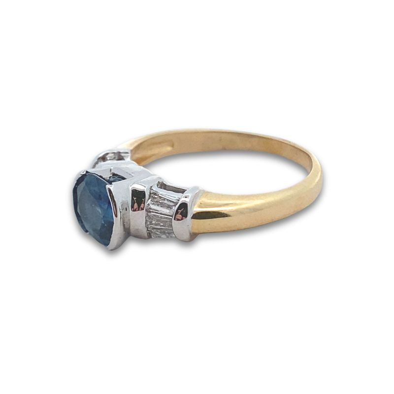 One east/west set 1.32ct oval sapphire, A Quality, half-bezel set between 6 tapered baguettes, 0.25ctw VS-SI G, giving the look of a three-stone ring. Crafted in 14kt white and yellow gold. Sizing available.