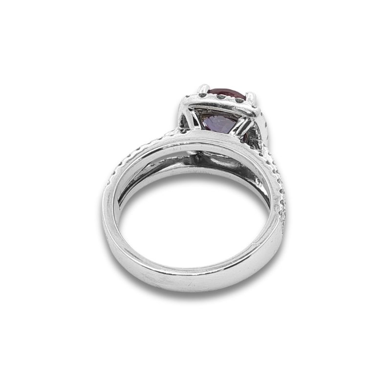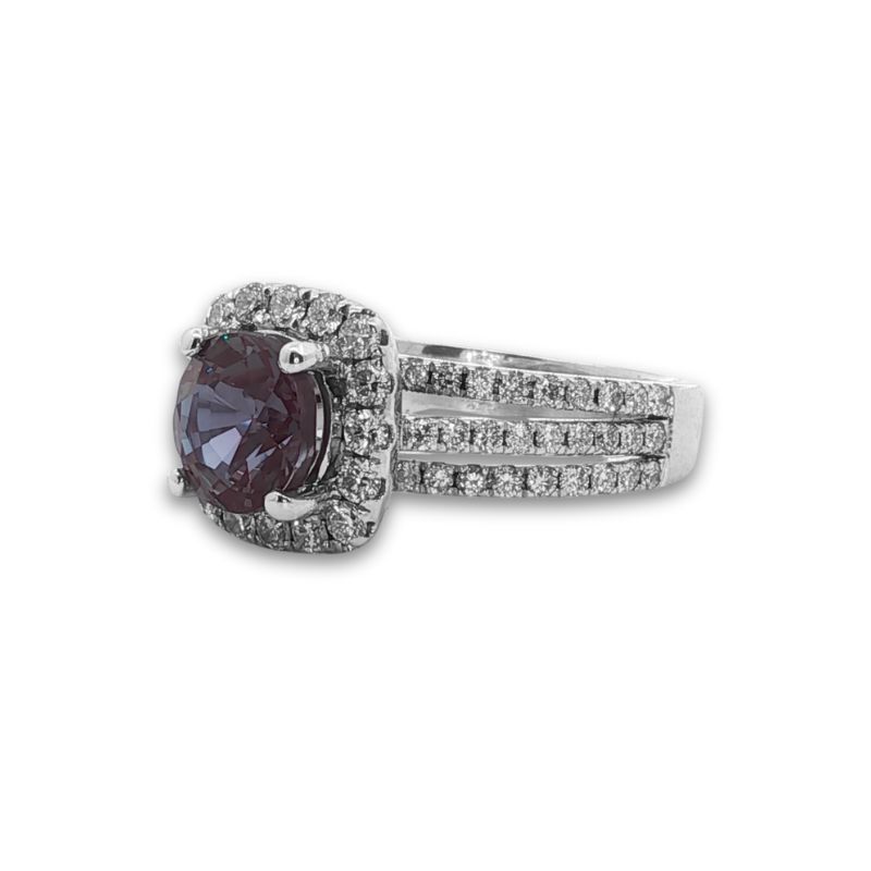 70 Round Diamonds Split Prong Set at 0.77ctw, VS Clarity and F-G Color. 1.82ct Lab Grown AAA Alexandrite Center. Crafted in 14kt White Gold