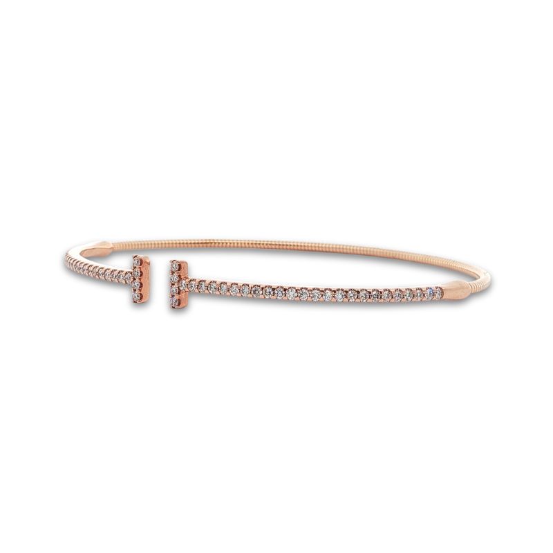 One 1.75mm wide flexible cuff bangle featuring 56 round diamonds prong set weighing 0.55ctw. Crafted in 14kt rose gold with polished finishes.
