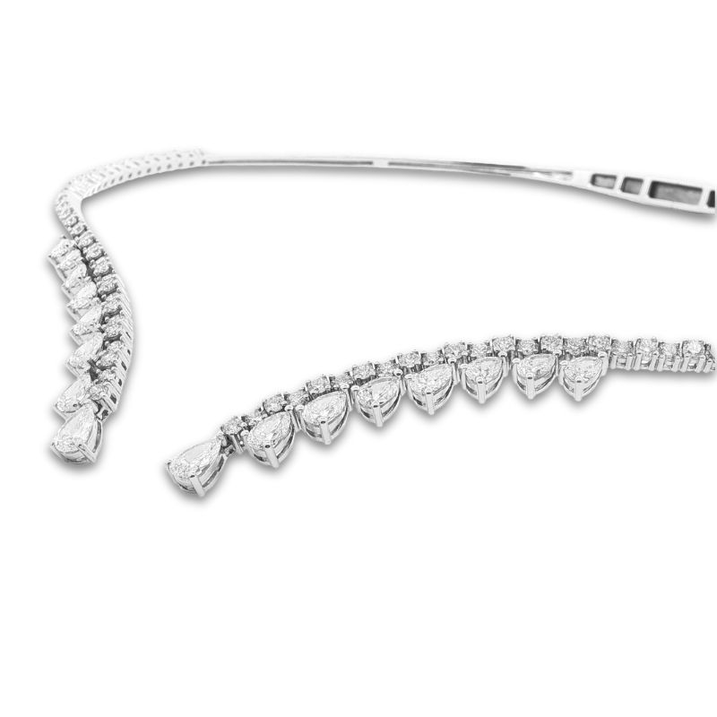 84 Round and 16 Pear Shape Lab Grown Diamonds Prong set at 9.66ctw, VS Clarity and F Color. Perfect Elegance and Sophistication, giving the look of a $50,000 Necklace. Crafted in 14kt White Gold at 15″ long.