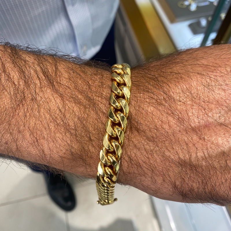 11mm Wide Miami Cuban, 8.2″ Long with Double Safety Box Clasp. Crafted in 10kt Yellow Gold