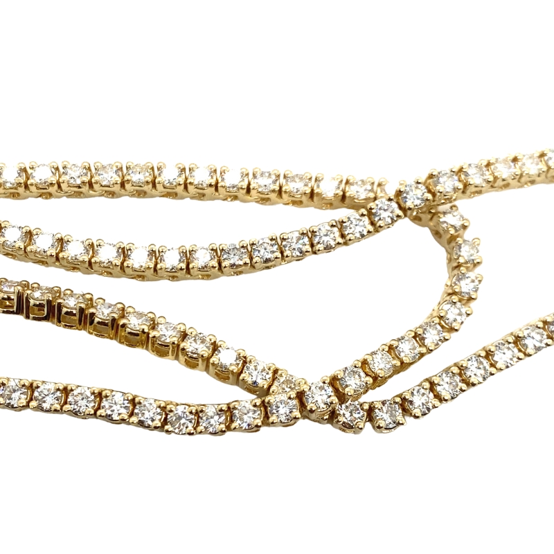 138 Round Lab Gorwn Diamonds Prong Set at 13.20ct, VS Clarity and F Color. 20″ Long and Set in 14kt Yellow Gold.