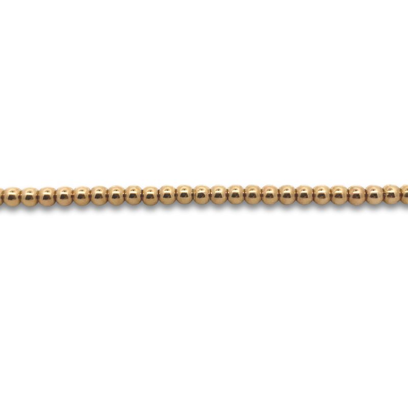 One 14kt polished, yellow gold, hollow bead bracelet with loops to adjust length. Length – 6″, Width – 3.0mm.