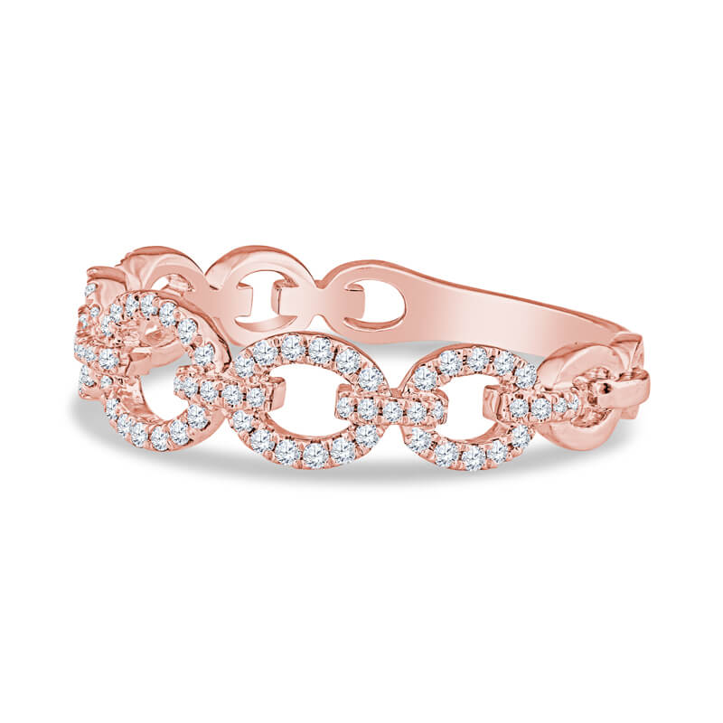 14kt rose gold diamond halfway oval link fashion ring, 86rd 0.20ctw SI1/F-G. Size- 6.5. Sizing available upon request.