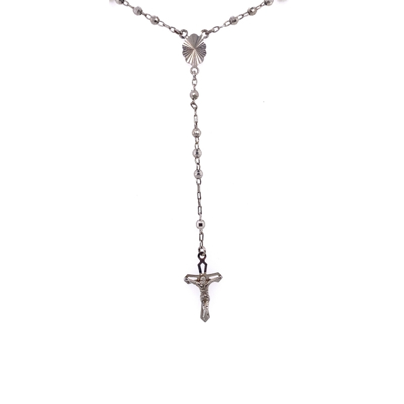 14kt white gold diamond cut beaded rosary, 17″ long, the center cross hangs down 3.5″ from chain