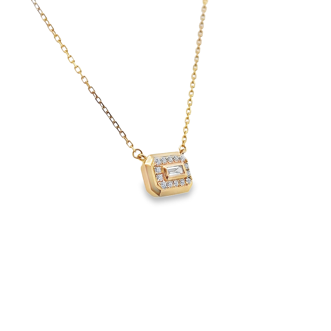 1 0.07ct Baguette Channel Set and 14 Round Pave Set at 0.08ctw, SI-1 Clarity and F Color. 10x7mm Frame, Crafted in 18kt Yellow on Cable Chain
