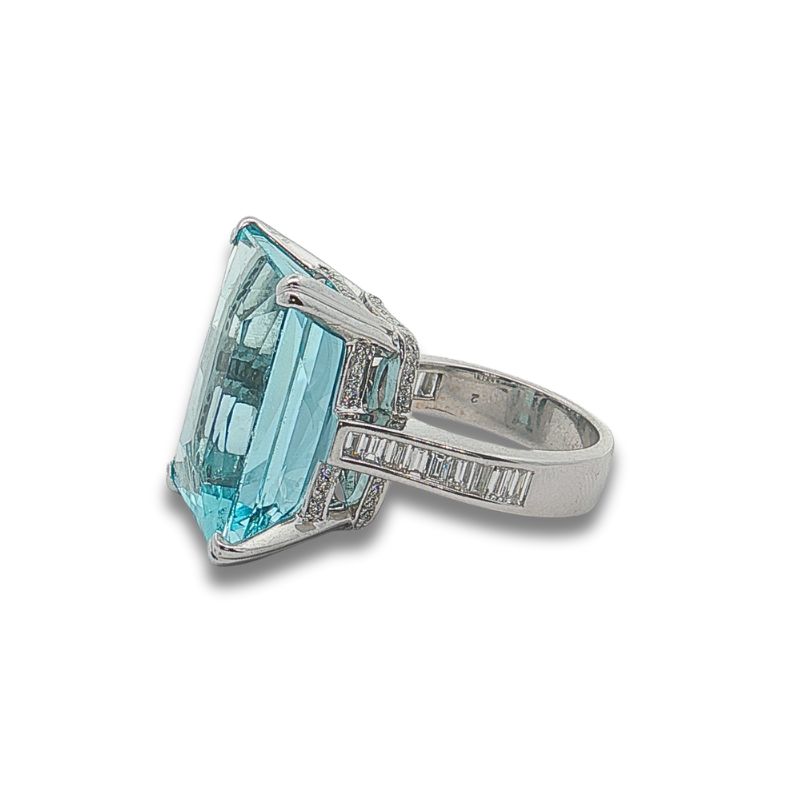 20x15mm 21.00ct Aquamarine Ring with 18 Baguette Diamonds and 64 Round Diamonds Pave Set total 1.00ctw, VS-SI-1 Clarity and F=G Color. Crafted in 18kt White Gold