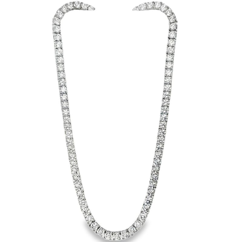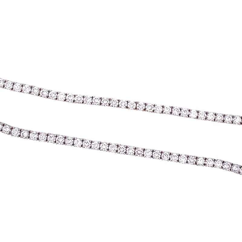 111 Round Lab Grown Diamonds Prong set at 27.60ctw, VS Clarity and F Color. 18~22 Long and Crafted in 14kt White Gold