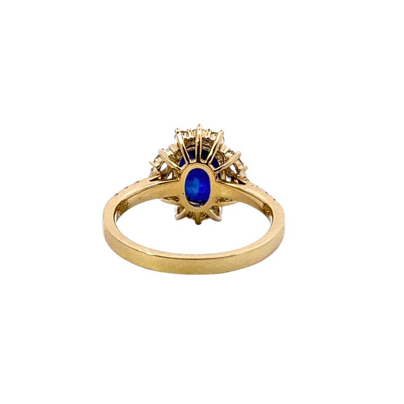 14 Round and 4 Marquise Lab Grown Diamonds at 0.66ctw, One 9.2x7mm Lab Grown AAA Saphirwe at 2.94ct. Crafted in 14kt Yellow Gold