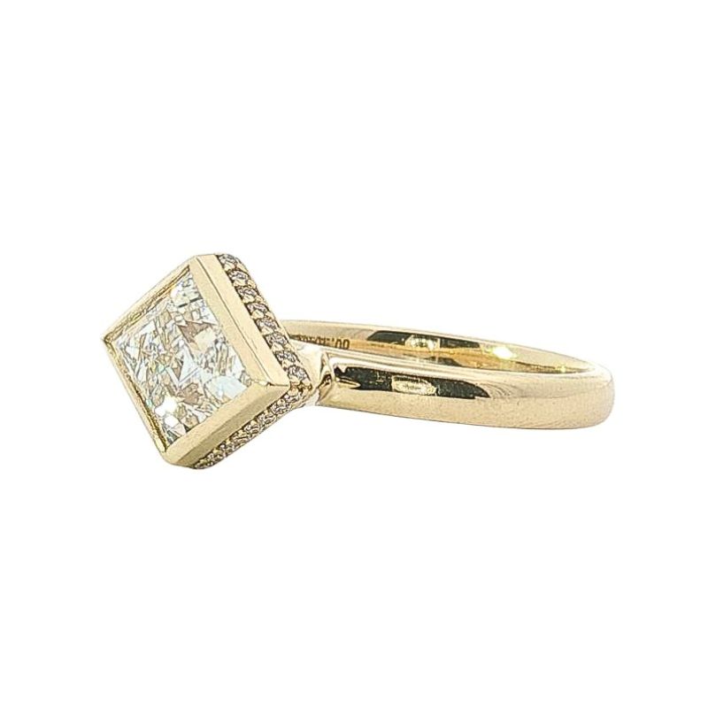 Timeless Bridal Sideways Bezel Set Engagement with 32 Round Pave Set Diamonds at 0.15ctw, VS Clarity and E Color. Center Lozenge 3.05ct, VS-1 E Color. All Ring Lab Grown Crafted in 14kt Yellow Gold