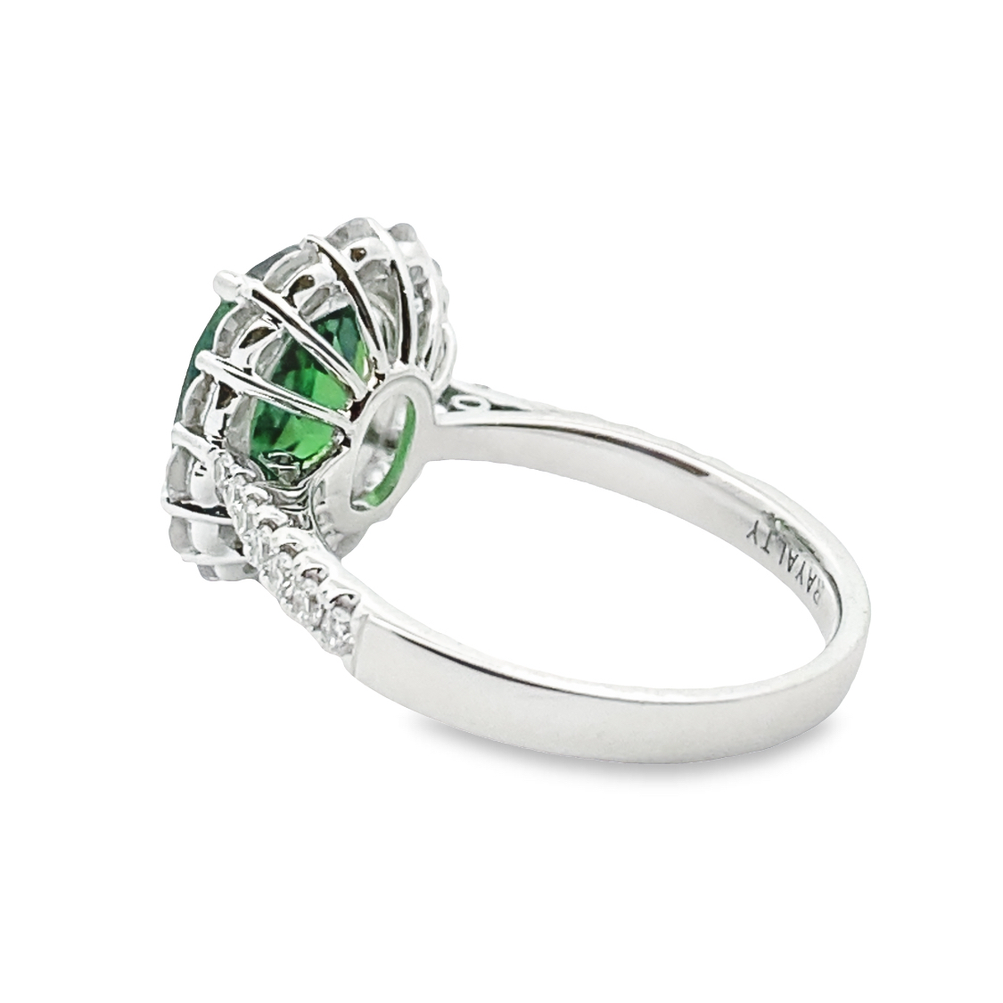28 Round Diamonds on Shank and Halo at 0.93ctw, SI Clarity and G in Color. 10x8mm Oval 3.00ct Bluish Green Tourmaline. Crafted in 18kt White Gold and Sizable upon Request