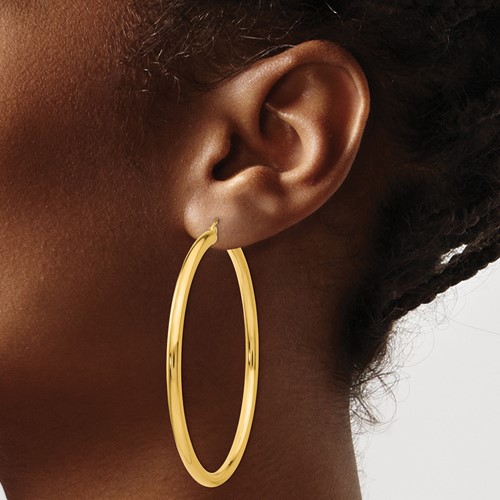 Large Polished Hoop Earrings, 14kt Yellow Gold. 3mm Tube, 55mm Long, Crafted in 14kt Yellow Gold