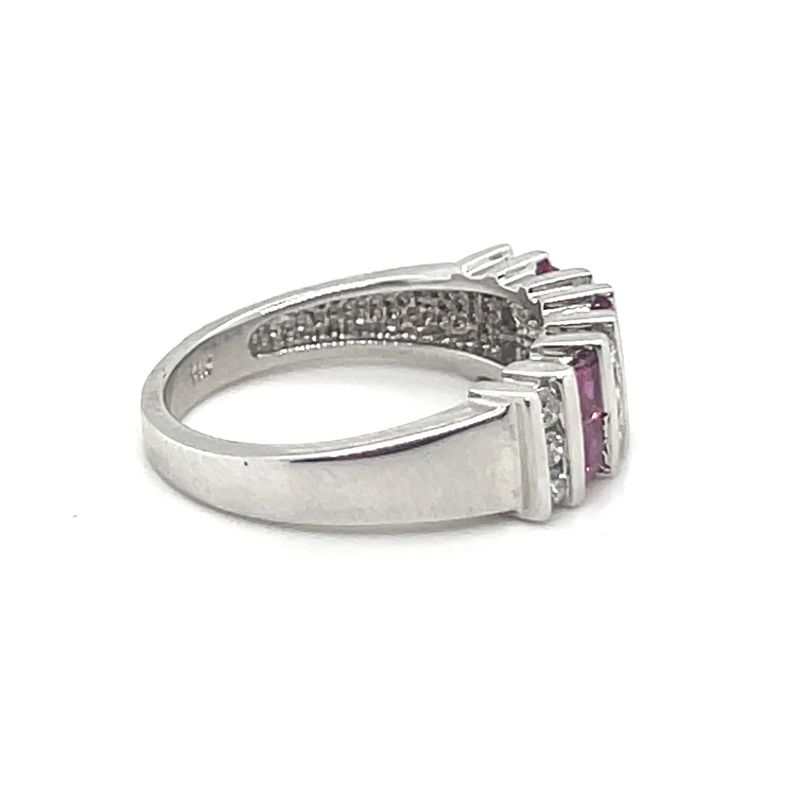 12 Round Diamonds Channel Set at 0.25ctw, SI-2 Clarity and G in Color. 6 2.75mm Ruby Step Cut Stones A Quality. 6.8mm Wide and Crafted in 14kt White Gold.