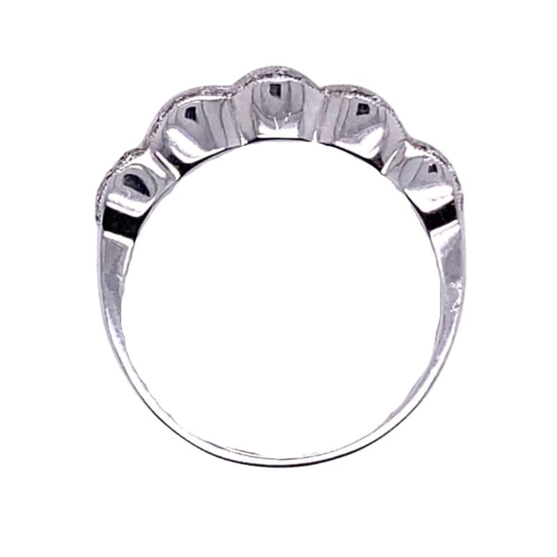 3 Row Scalloped Diamond Band with Channel Set Baguettes, 18kt white gold. Carat – 0.87cts The total of both Round and Baguette Diamonds. Clarity – VS. Color – GH Width – 7mm at the top tapering to 3.7mm. This band is sizable.