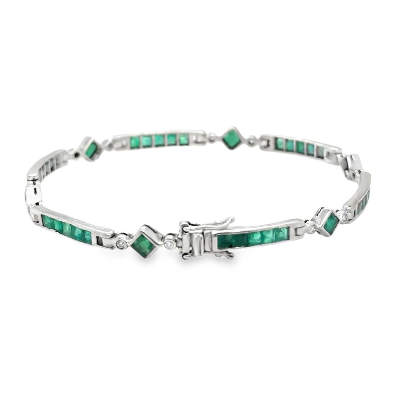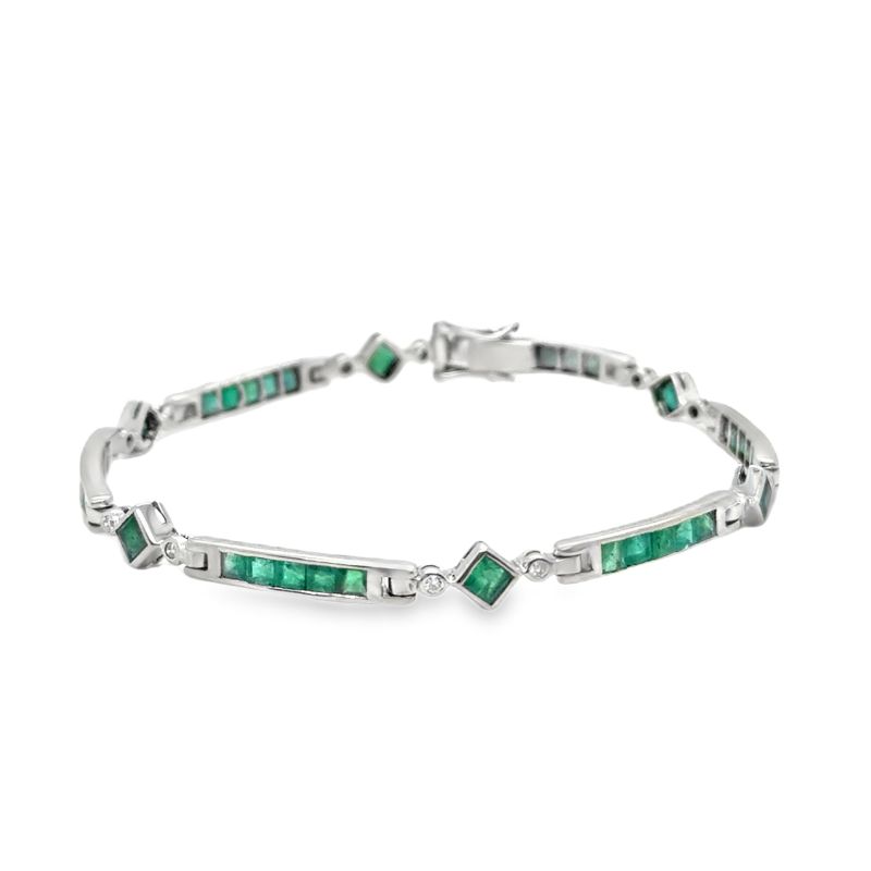 36 Step Cut Emeralds with Diamond Accents Channel et Vintage Bracelet, 14kt White