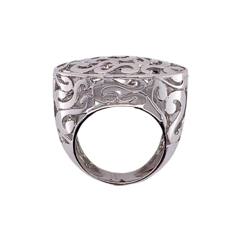 Ladies designer white gold ring with swirl designs. 14kt white gold. Size – 7. Sizing available upon request. Additional charge may apply.