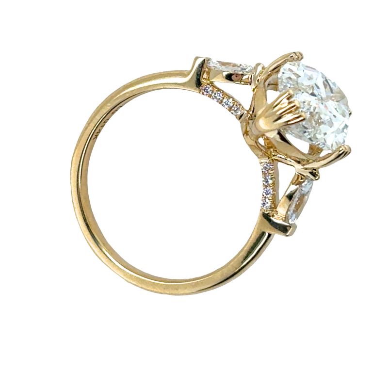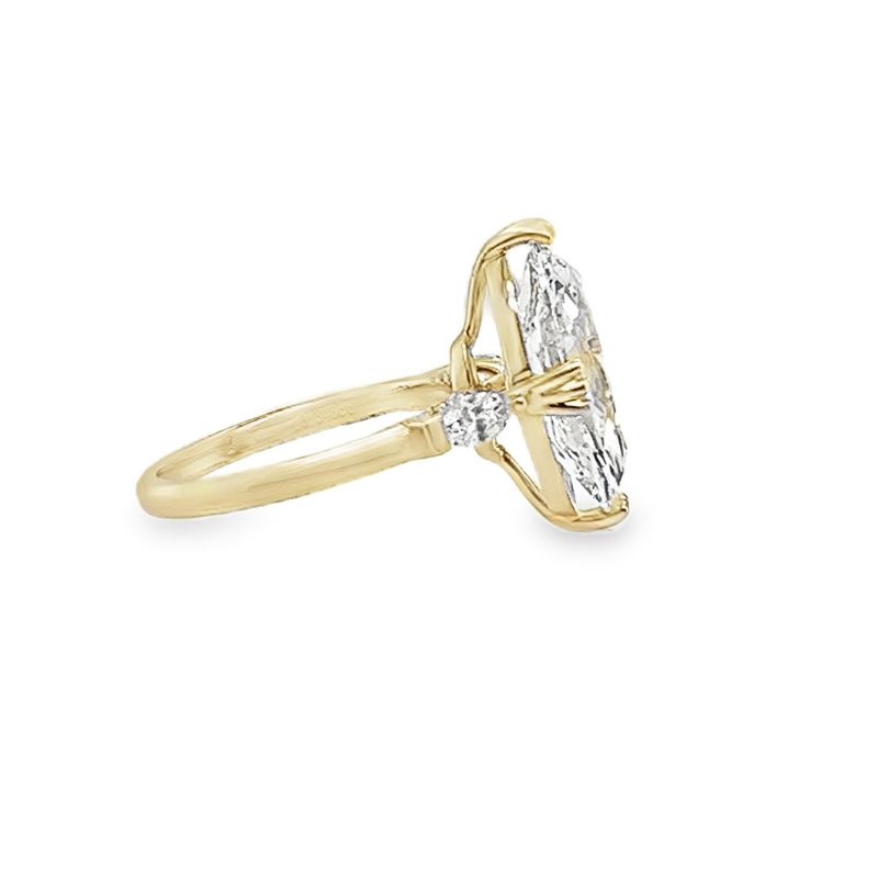 Timeless Bridal Engagement with 16 Round and 2 Marquise Lab Grown Diamonds at 0.35ctw, VS Clarity and F-G Color.~0D~0ACenter Lab Grown Moval 5.07 VS-1 F IGi Cert #LG694553775. Crafted in 14kt Yellow