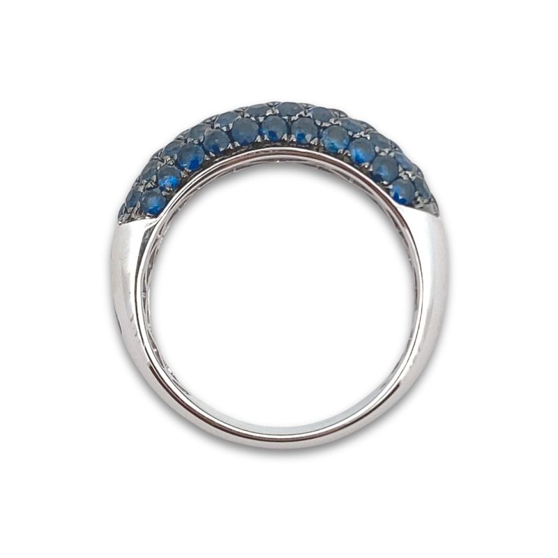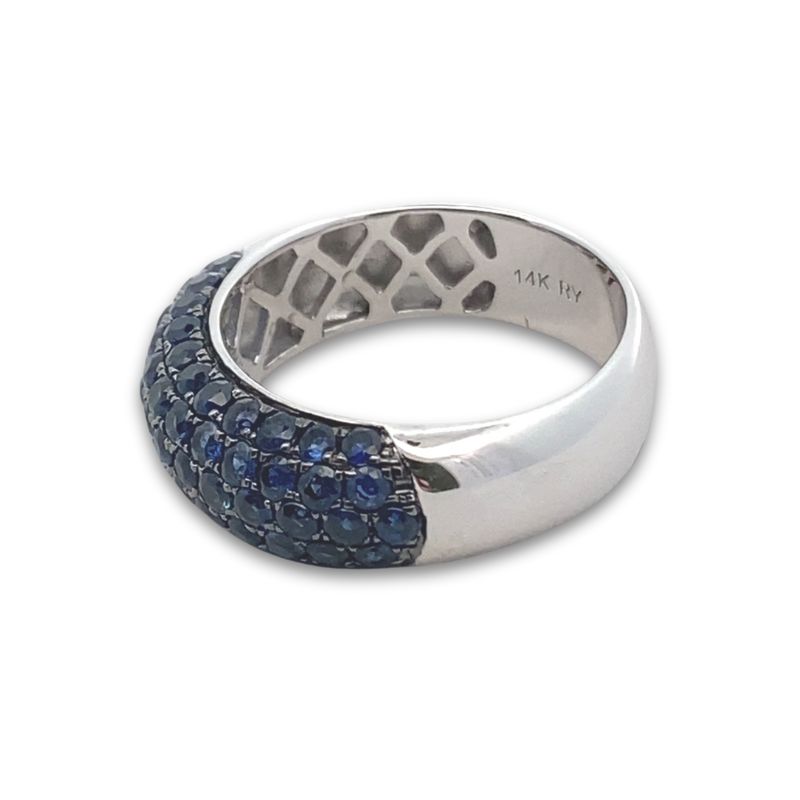 One 7mm wide domed band with pave set blue sapphires, 2.06ctw. Crafted in 14kt white gold. Sizing available.