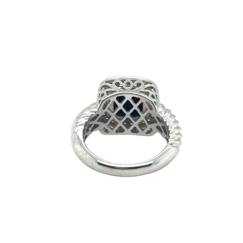 9mm Cushion Shaped Garnet Bezel Set with 26 Round Diamond Pave Set. 13.5mm Wide with 5.5mm Wide Graduating Twisted Band Crafted in 14kt White Gold