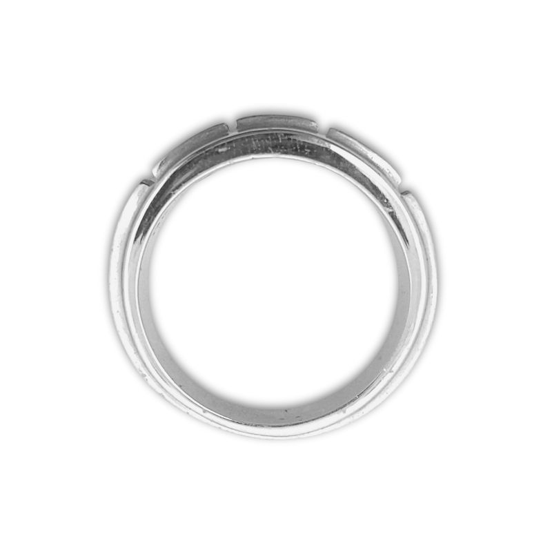 One 9mm wide men’s wedding band with three round diamonds gyspsy set and crafted in 14kt white gold with satin finshed center and polished stepped edges.