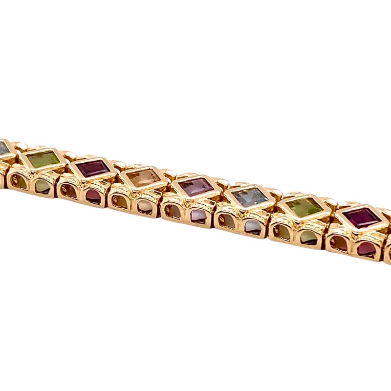 Alternating Semi-Precious Color Bracelet, 5.0mm Step Cut Peridot, Blue Topaz, Amethyst, Citrine, Garnet. Set in 14kt Yellow Gold