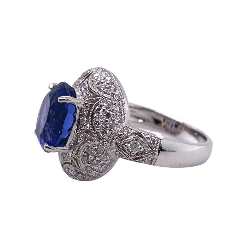 Set in 18kt polished white gold, one 4.31ct oval tanzinite is prong set in an edwardian-style diamond halo with 0.80cts of SI1/F-G diamonds. Size – 6.5. Sizing available upon request.