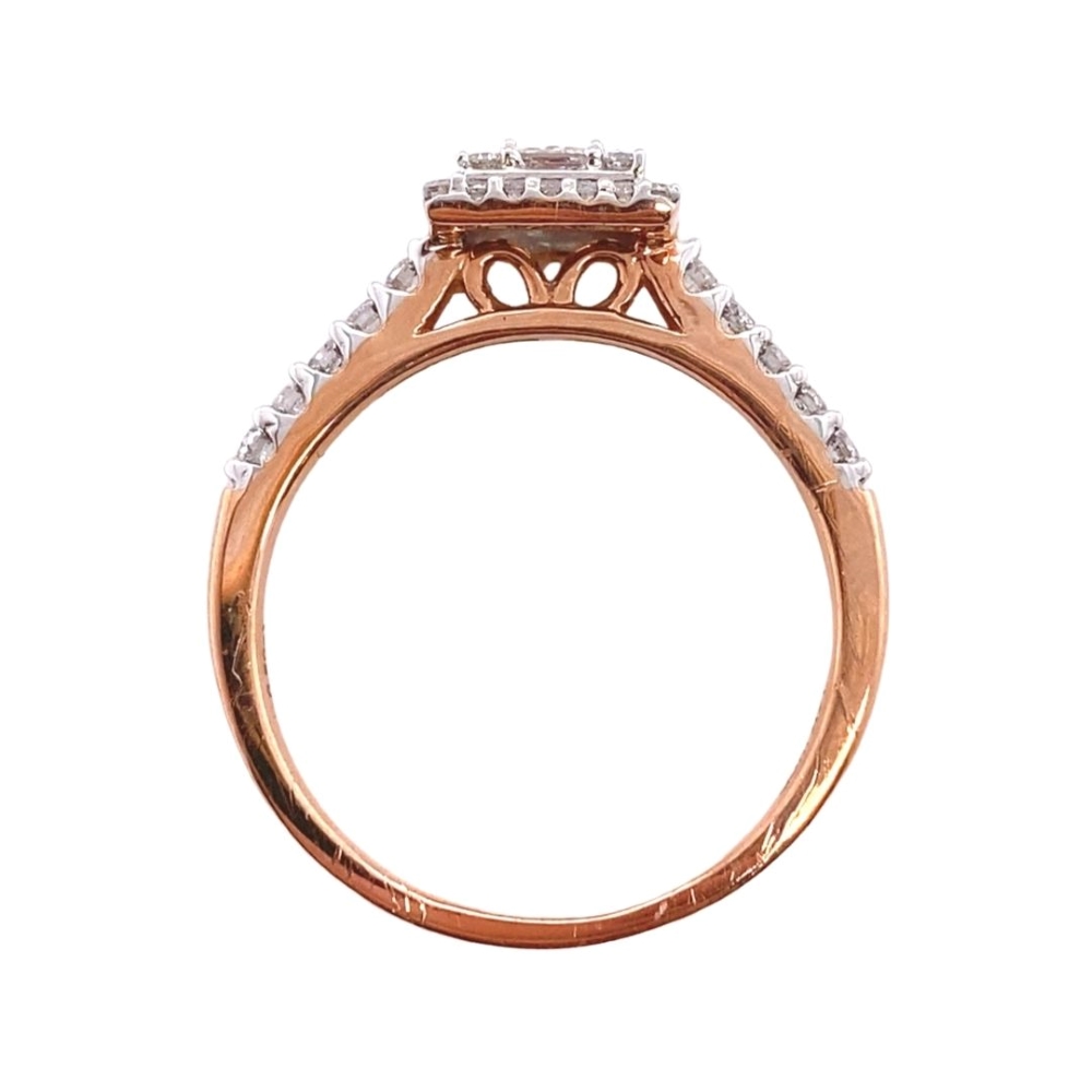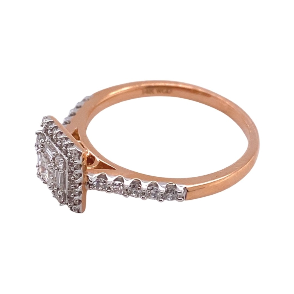 Baguette, Princess, and Round Diamond Engagment Ring, with 38 round diamonds on halo and 1/2 down band. 1 Princess diamond center stone, surronded by 4 baguette stones. Carat 0.50, Clarity SI-1-2, Color F/G, invisibly set in 14kt Rose and White Gold.