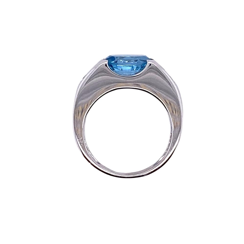 Band with Oval Blue Topaz, 14kt white gold. 10mm Blue Topaz – 3.60cts, 8 PC Blue Topaz – 1.44cts. Widthe – 8mm. This ring is sizable.