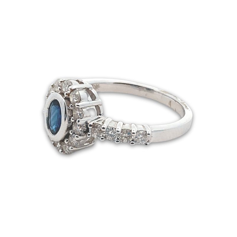One bezel set sapphire center stone, 0.68ctw, with a diamond halo and 1/4 diamond shank. There ate a total of 20 round, natural SI1 G diamonds with a total carat weight of 0.83ct. Crafted in 18kt white gold with polished finishes. Sizng available.
