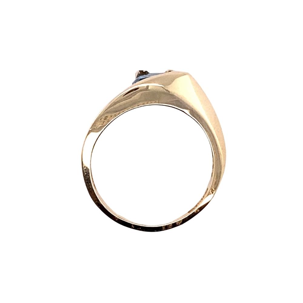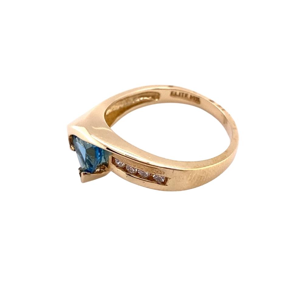 Blue Topaz Ring with Diamond accents, 14kt yellow gold Blue Topaz Trillion – 0.80cts, 4 Diamonds – 0.10cts. Width – 9mm. This ring is sizable.