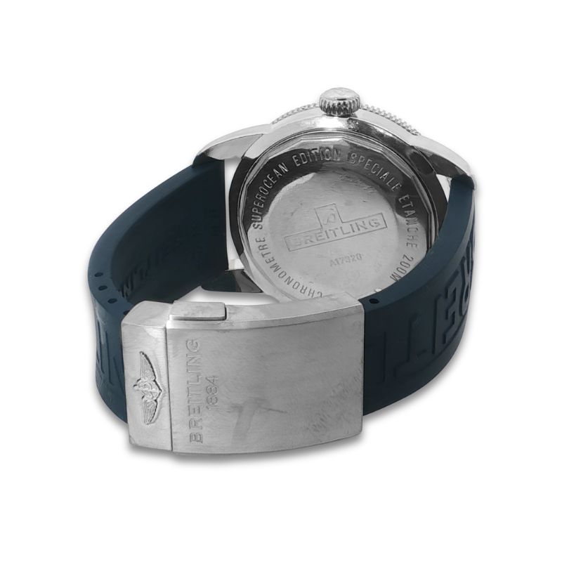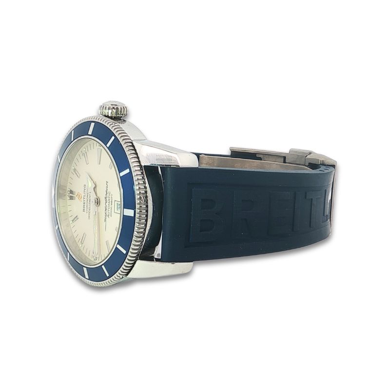 Breitling Super Ocean Heritage, Ref #A17320. 46mm Stainless Steel Case, Silver Dial and Blue Rubber Deployment Strap. Preowned with Minor Scratch on Bezel, Comes with Box and Full 2 Year Warranty