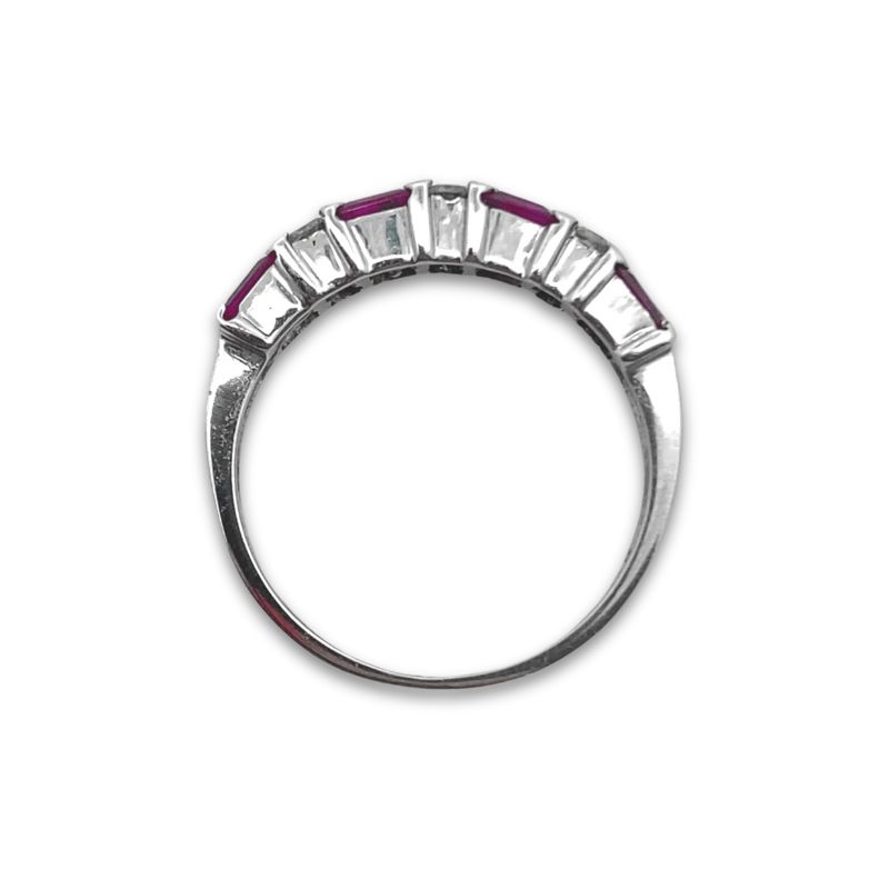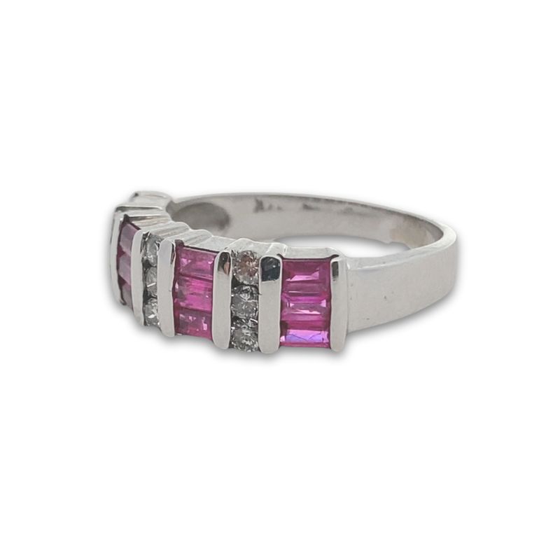 9 Round Diamonds Channel Set at 0.27ctw, I-1 Clarity and H Color. 12 Baguette Ruby Channel Set Pinkish Red A Quality Ruby. 5.7mm Wide Crafted in 14kt Whtie Gold