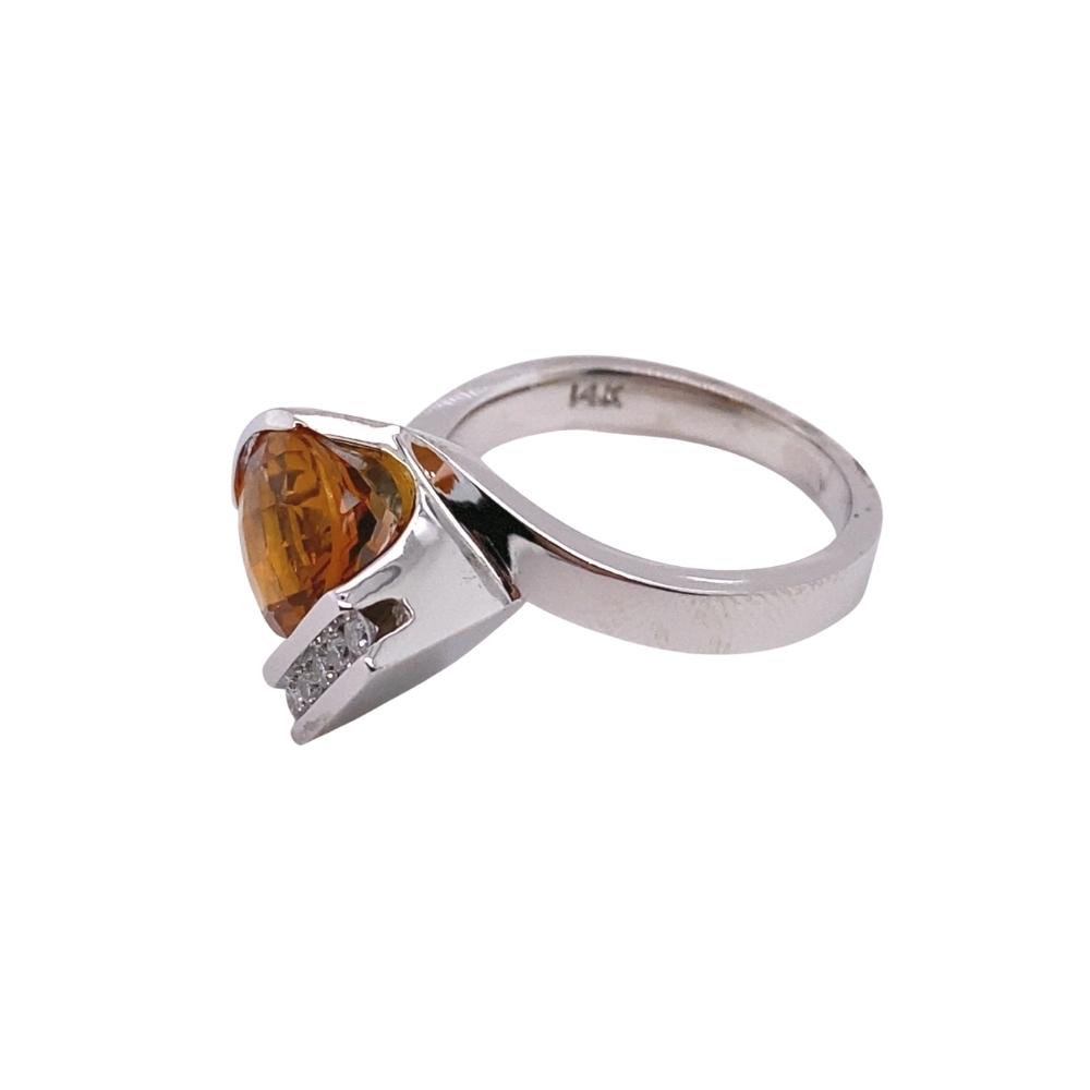 Oval Citrine ring with Diamond Accents, 14kt white gold. Citrine – 2.45cts, 5 Round Diamonds – 0.13cts. This band is sizable.