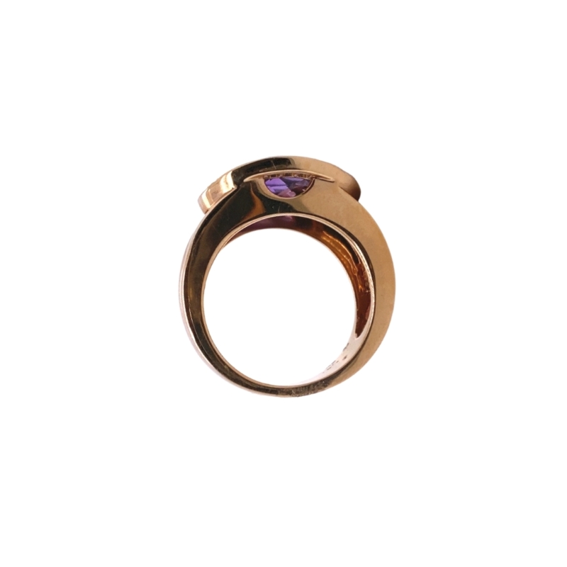 One 18kt polished, rose gold ring with one 3.96ct checkerboard top amethyst bezel set within a 0.37ct diamond halo made up of 29 round SI1/F-G diamonds. Size – 7. Sizing available upon request. Additional charges may apply.