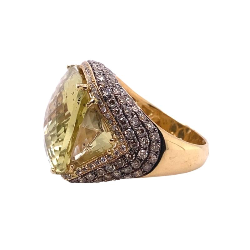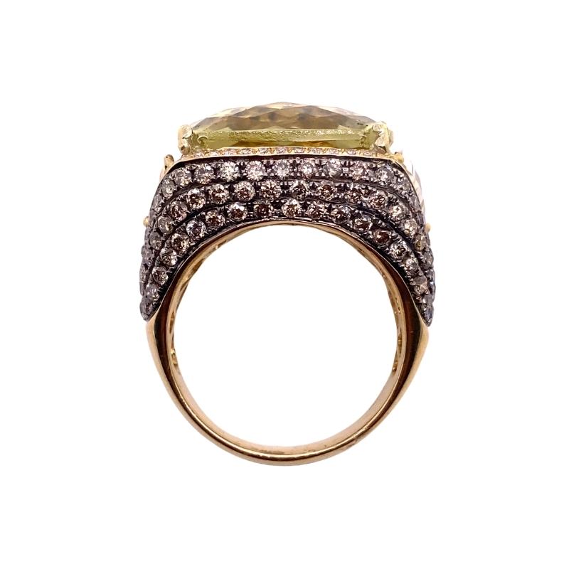 One 14kt polished yellow gold chunky cocktail ring setting featuring a 21.58ct cushion-cut lime quartz center stone prong set within a 0.28ct white diamond side frame. Below this section, there is a black rhodium treated section to accent the pave set brown diamonds weighing a total of 1.83cts. Size – 7.75. 20mm Wide
