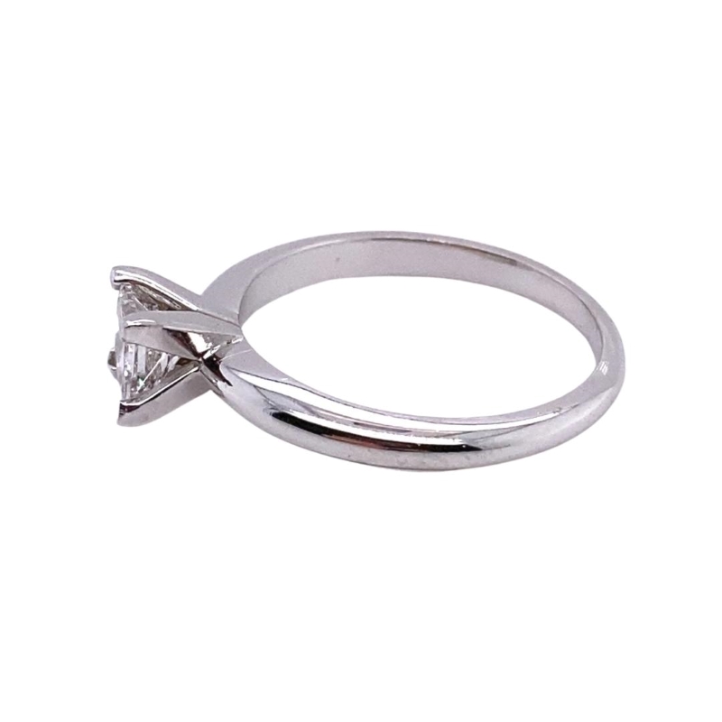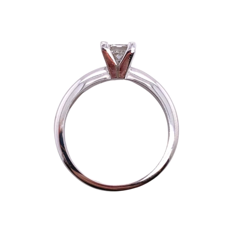 One princess cut solitaire engagement ring prong set in 14kt white gold. Carat – 0.71ctw, Clarity – SI/1, Color – G.