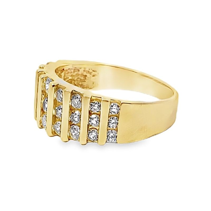 9 rows of vertically bar set round CZ stones, 27 total, in 14kt polished yellow gold. Ring tapers from 7.6mm at widest point down to 3.15mm at base of shank. Finger size – 6.