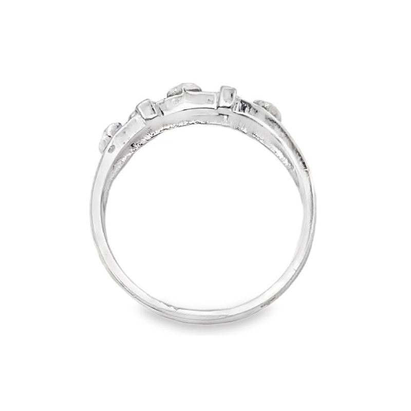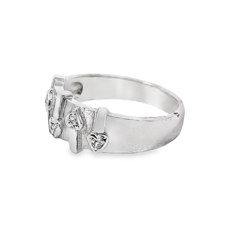 5 CZ stones set into heart motifs with bars in 14kt white gold. This ring features a brushed finish between the heart motifs with a polished finish begining halfway down the shank. Shank tapers from 7.2mm to 3.5mm. Finger Size – 6.75.