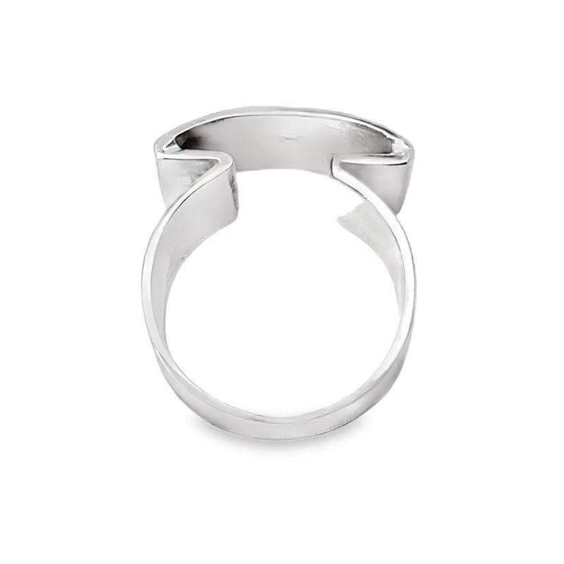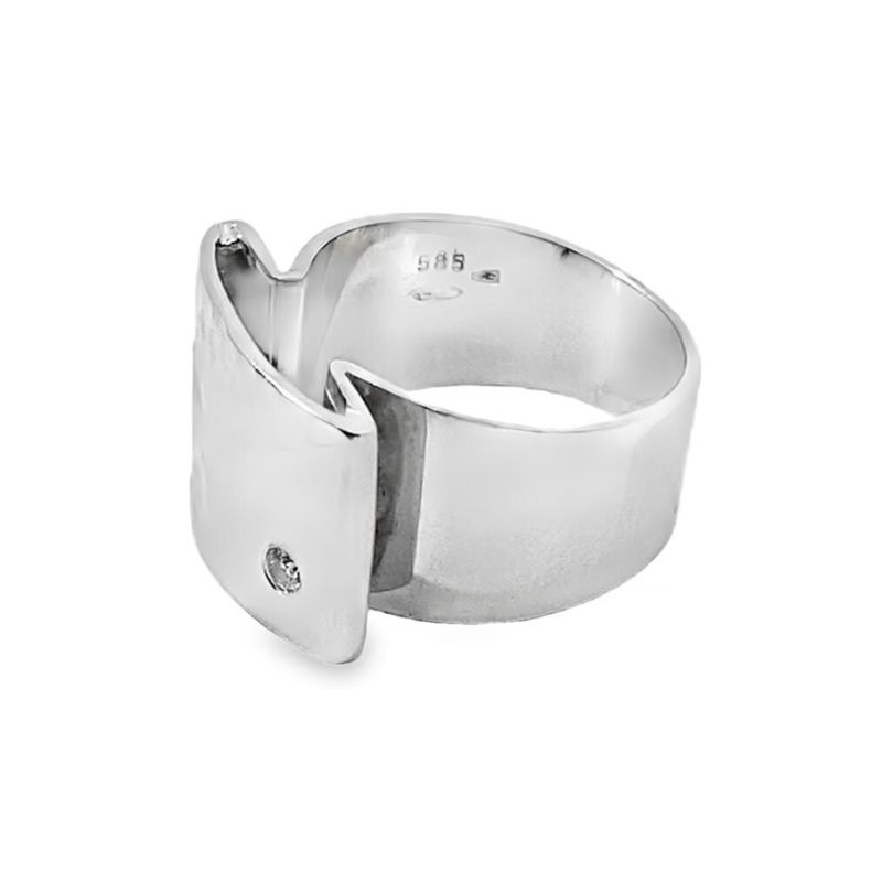 One 14kt white gold fashion ring with one round CZ stone gypsy set in a half hammered, half polished rectangular plate. Dimensions of plate are – 19.13 x 13.36 mm. The shank tapers from 11.93 mm to 7.7 mm.
