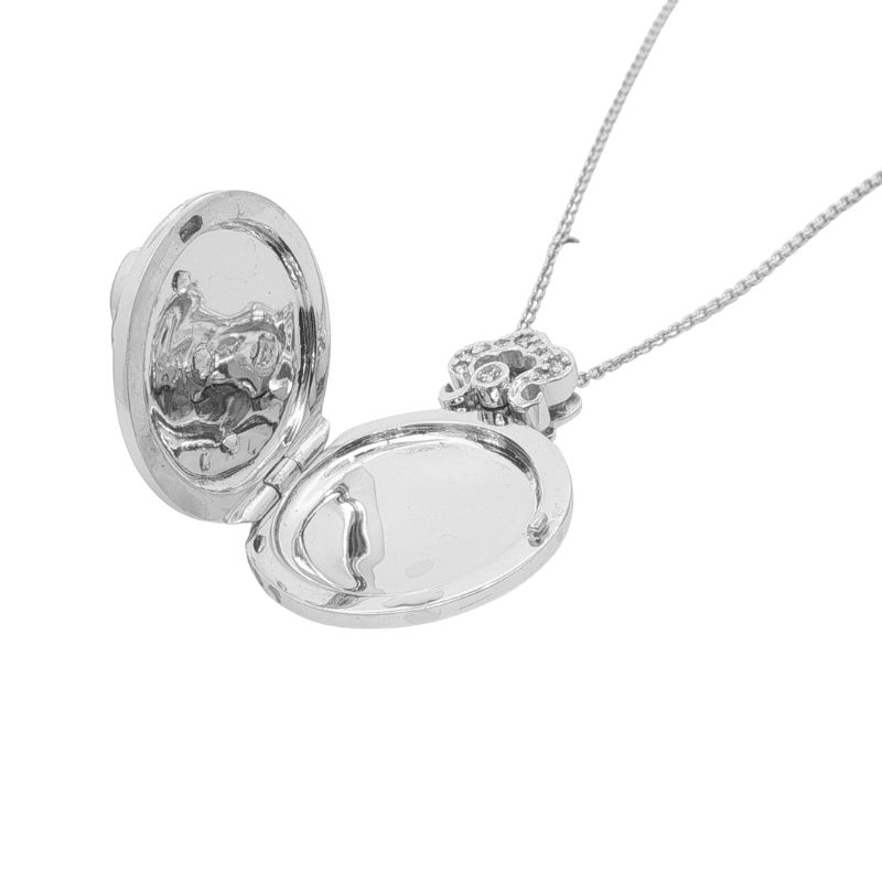 One ladies locket pendant crafted in 18kt white gold with satin finish featuring a script font style dimond ~22M~22 prong set with milgrain finishes and a accented diamond bail. Locket is 19.5mm in diameter.