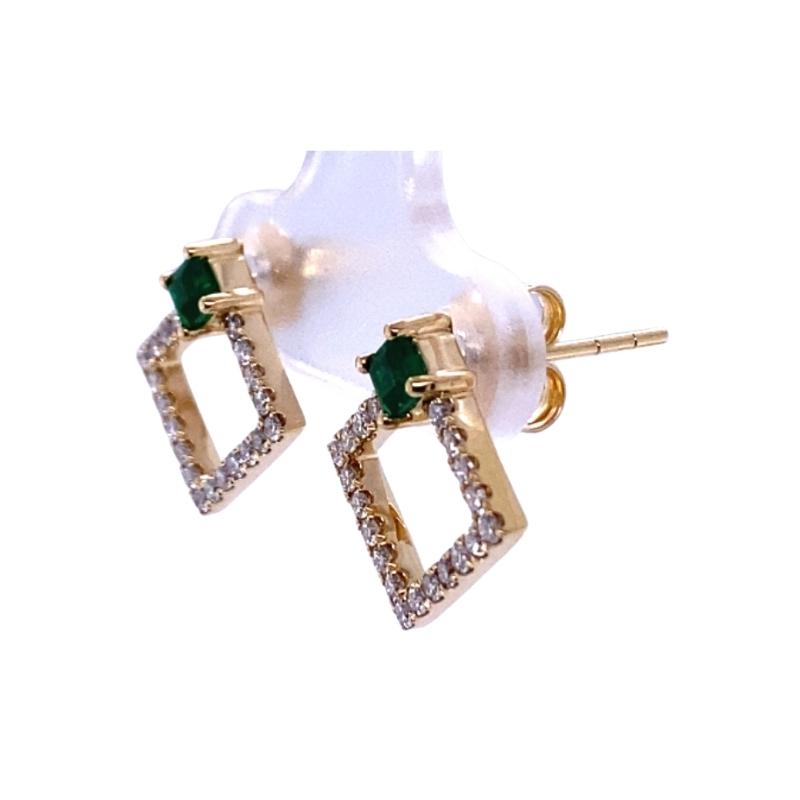 One pair of 14kt yellow gold studs with a total of 42 round SI1/F-G diamonds, 0.38ctw, prong set in a tilted square design with a single emerald at the top point. There is a total carat weight of 0.27cts between the two princess-cut emeralds.