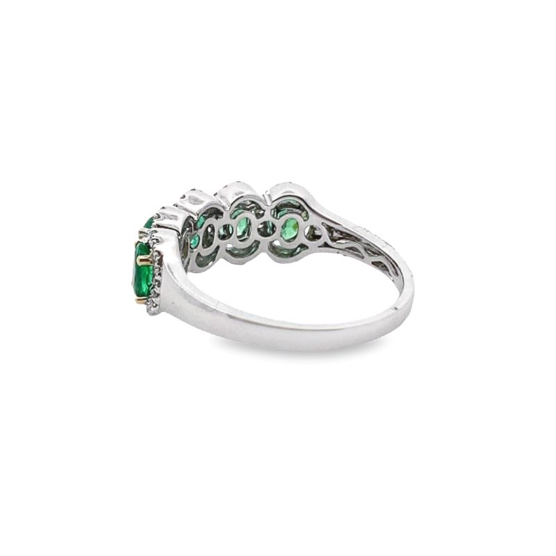 Ladies ring with 66-rd diamonds 0.26ctw, 5-emerald ovals 1.28 ctw, AAA, halfway around Band. 7mm Wide and crafted in 18kt white gold.